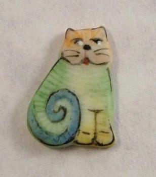 The color kitty is a hand painted porcelain button. It displays a variety of colors and fine details. The kitty measures 5/8" x 1/2" with a shank on the back.
